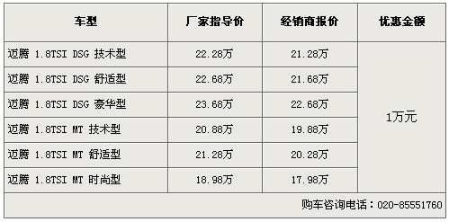 近日,筆者從一汽大眾相關(guān)經(jīng)銷商處了解到,目前邁騰的現(xiàn)車雖然比前段時間有所減少,但庫存基本能滿足消費者的需要,現(xiàn)購買1.8T有1萬元的現(xiàn)金優(yōu)惠。欲知更多優(yōu)惠信息,請致電購車咨詢電話:020-85551760 查詢。