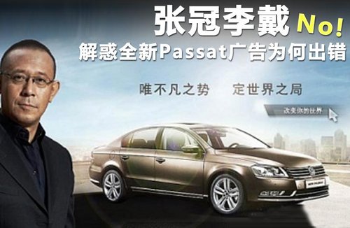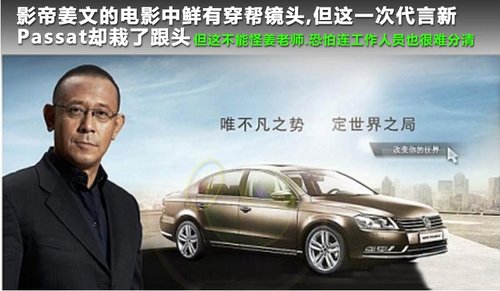 4月中下旬開始上海大眾全新一代Passat開始了陣勢龐大的宣傳,從重磅亮相上海車展到各 大網路、報紙的廣告鋪天蓋地般向中國消費者推介這樣一款全新的passat。然而外行看熱鬧內行看門道,在全新一代passat廣告亮相的第一天,這個宣 傳上的重大失誤隨即被發現。在諸多印刷和網絡上的全新一代Passat廣告中,代言人姜文身邊出現的竟然是一汽大眾的邁騰B7L。