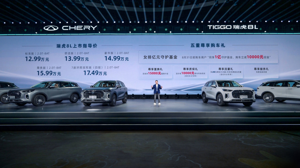 2024年8月8日,瑞虎8L全球上市發(fā)布會于成都隆重舉行,奇瑞發(fā)動機(jī)、變速箱、四驅(qū)系統(tǒng)全自研的旗艦SUV瑞虎8L正式上市,新車主打家用,官方指導(dǎo)價12.99萬元至17.49萬元。當(dāng)前下定還可尊享五重購車禮: