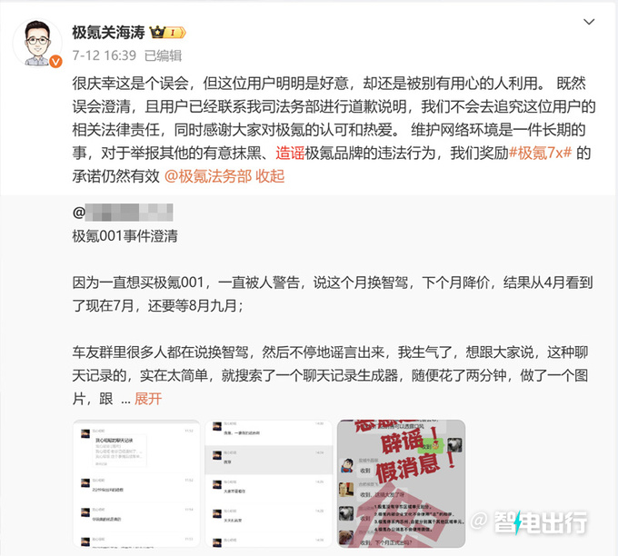7月12日,極氪智能科技CMO關(guān)海濤在個人社交平臺澄清,“新版本001于本月底正式公布”為假消息。這讓許多意向用戶以為極氪001近期沒有改款計劃而直接提車。