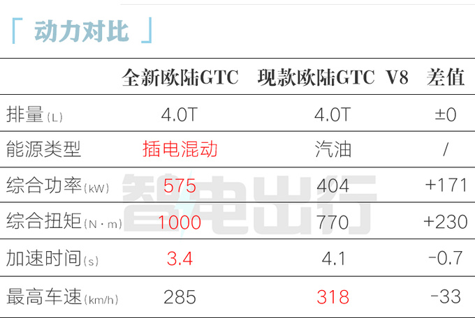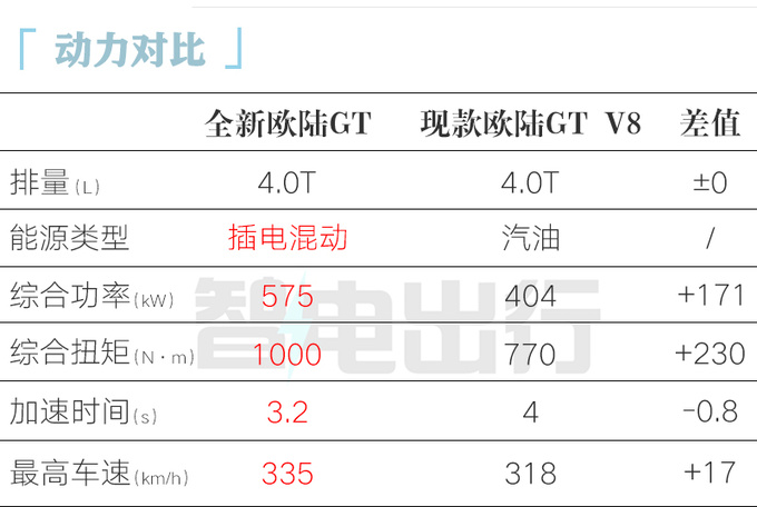 全新歐陸GT極致版搭載的高性能混動系統由一臺4.0T V8發動機+電機組成,發動機最大功率441kW,峰值扭矩800N·m;電機最大功率140kW,峰值扭矩450N·m。新車WLTP工況純電續航81km,綜合續航859km。