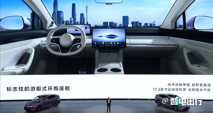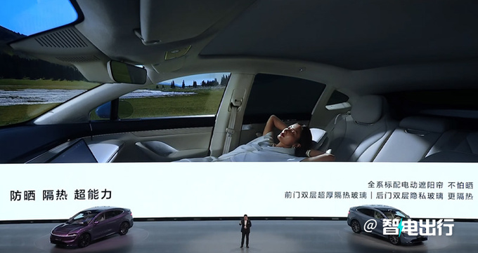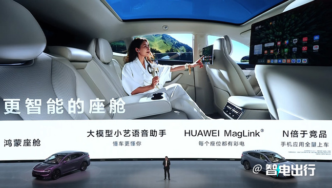 智界R7采用游艇式環抱座艙,配備12.3英寸領航屏、冰箱、彩電、雙層隔熱玻璃/隱私玻璃、絲云大沙發、大模型小藝語言助手和HUAWEI MagLink等。車內二排頭部空間超過一米,副駕提供零重力座椅和電動遮陽簾,支持18向電動調節、10點按摩、340mm腿托。前備箱支持電動吸合,后備箱容積837L,采用三區分層設計。