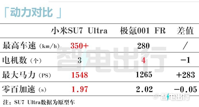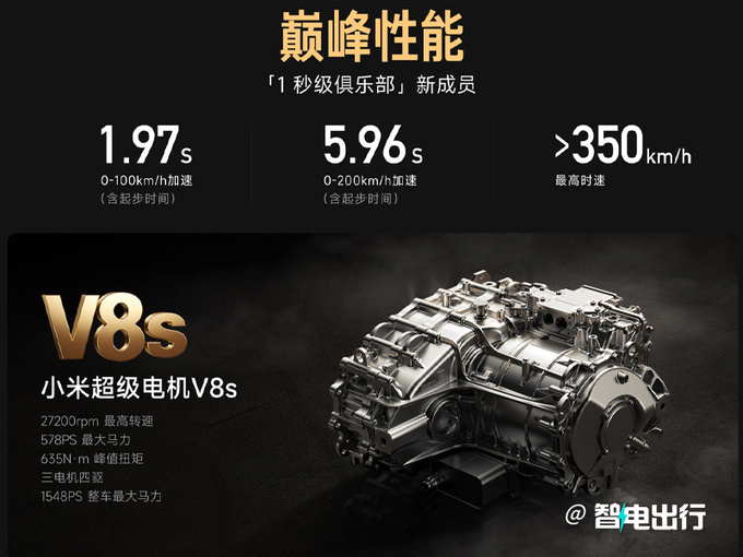SU7 Ultra原型車采用3電機全輪驅動,小米超級電機V8s(2顆)最大馬力578Ps,峰值扭矩635N·m,最高轉速27200rpm,0-100km/h(含起步)加速1.97s,0-200km/h加速5.96s;匹配寧德時代麒麟II電池包,放電功率1330kW,充電倍率5.2c。