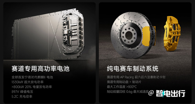SU7 Ultra原型車整備質量1900kg,下壓力達到2145kg。剎車系統使用AP Racing前/后6活塞卡鉗,并配備賽道專用制動盤和制動片,電機動能回收最大減速度0.6g,最大功率超400kW,100-0km/h制動距離25m。
