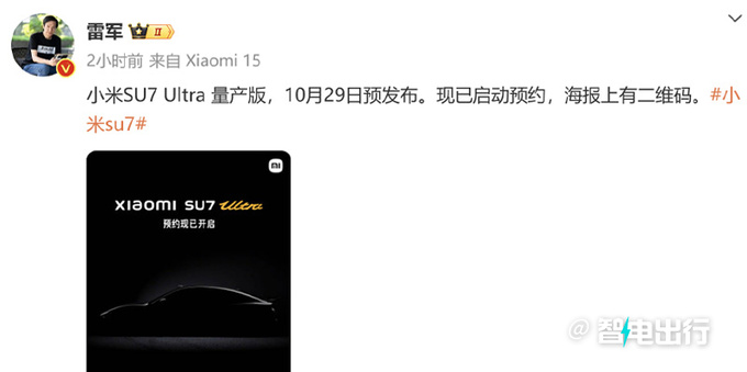 小米創辦人,董事長兼CEO雷軍表示,小米SU7 Ultra量產版將于10月29日預發布。SU7 Ultra原型車采用15㎡碳纖維覆蓋+夸張的空氣動力學套件,搭載3臺小米自研高性能電機+賽用高效率電池包組成的動力系統,馬力達1548匹,最高時速超350km/h。