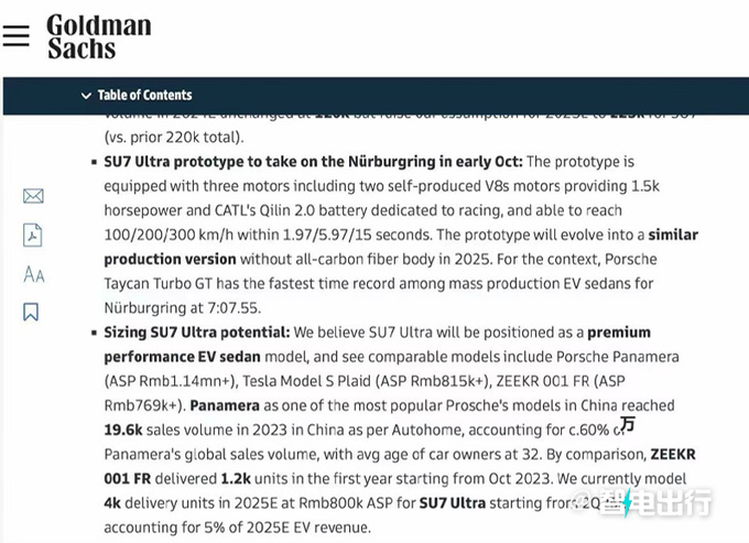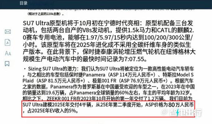 根據知名金融機構高盛集團(Goldman Sachs)的預測:小米SU7 Ultra量產版將在明年售出4000輛,平均售價約80萬元人民幣,貢獻公司電動汽車收入的5%。