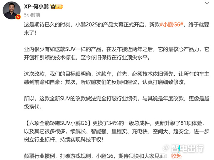 小鵬汽車董事長何小鵬表示,這款全新SUV的改款做法完全打破行業慣例,更像是越級換代。全車更換34%的一級總成件,更新升級81項體驗。