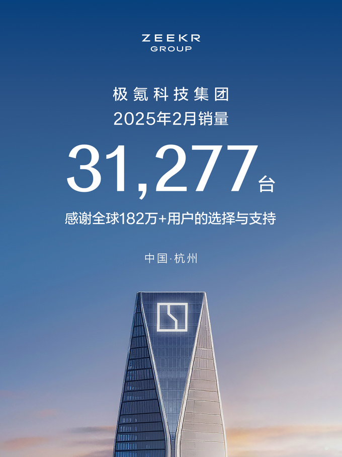 3月1日,新近成立的極氪科技集團公布2025年2月銷量31,277臺,領跑中國新勢力高端豪華市場。其中,旗下極氪品牌2月銷量14,039臺,同比增長86.9%,環(huán)比增長17.6%。旗下領克品牌2月銷量17,238臺,同比增長30.5%,新能源占比47.9%。隨著極氪009浩瀚智駕版開啟交付、領克900展車陸續(xù)到店,智能化以及全球化加速推進,極氪科技集團彰顯出強勁的持續(xù)增長勢能。2月,極氪001、極氪X開啟非洲征程,領克08 EM-P正式登陸歐洲。截至目前,極氪科技集團已進入60多個國際主流市場,海外門店超100家。未來,極氪領克將繼續(xù)釋放更大的協(xié)同效力,打造全球領先的高端豪華新能源汽車集團。
