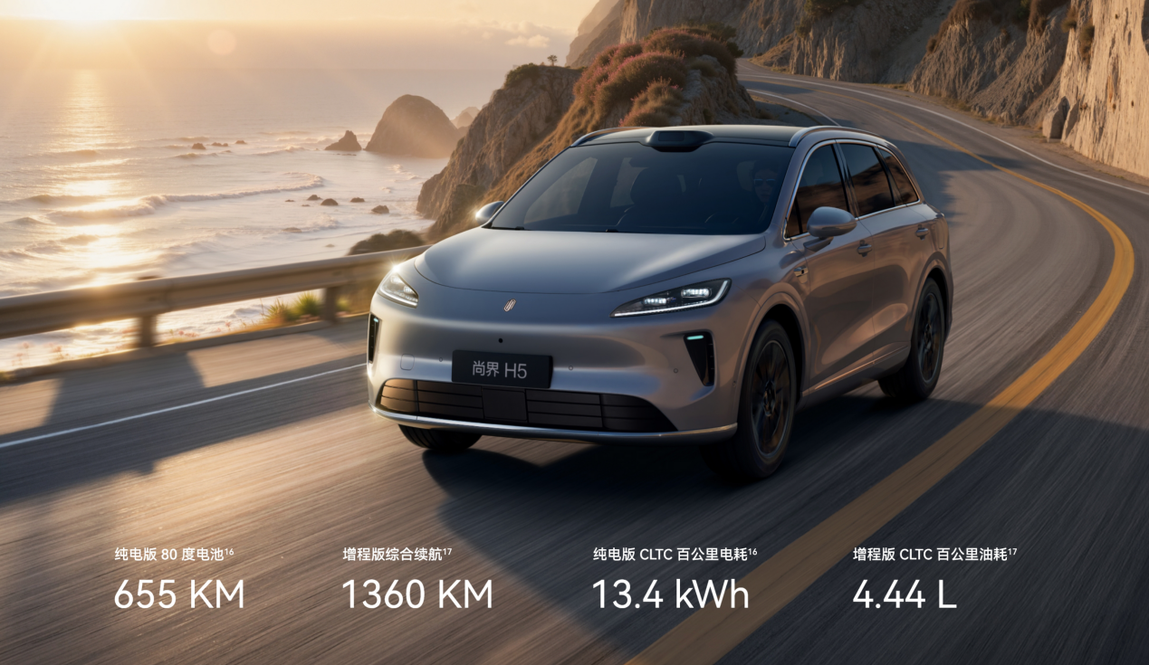 尚界H5增程版全系搭載32.6度電池,百公里油耗僅4.44L,CLTC綜合續航高達1360km,不僅續航出色,在靜謐性、平順性方面也處于行業第一梯隊。純電車型續航在CLTC工況下可達655km,百公里電耗13.4kWh,周末時開著車帶上家人去周邊城市游玩,它也足以滿足你的出行需求。